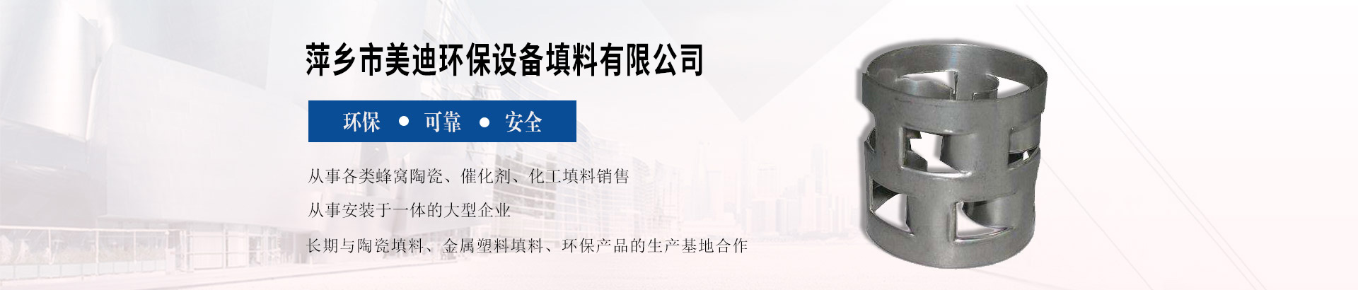 萍鄉(xiāng)市美迪環(huán)保設(shè)備填料有限公司前身為建于70年代的原萍鄉(xiāng)市化工填料公司。公司位于“中國(guó)工業(yè)陶瓷之都”――江西省萍鄉(xiāng)市湘東區(qū)下埠工業(yè)園,緊鄰滬昆高鐵、浙贛鐵路、滬瑞高速和國(guó)道319、320線,臨距黃花國(guó)...
